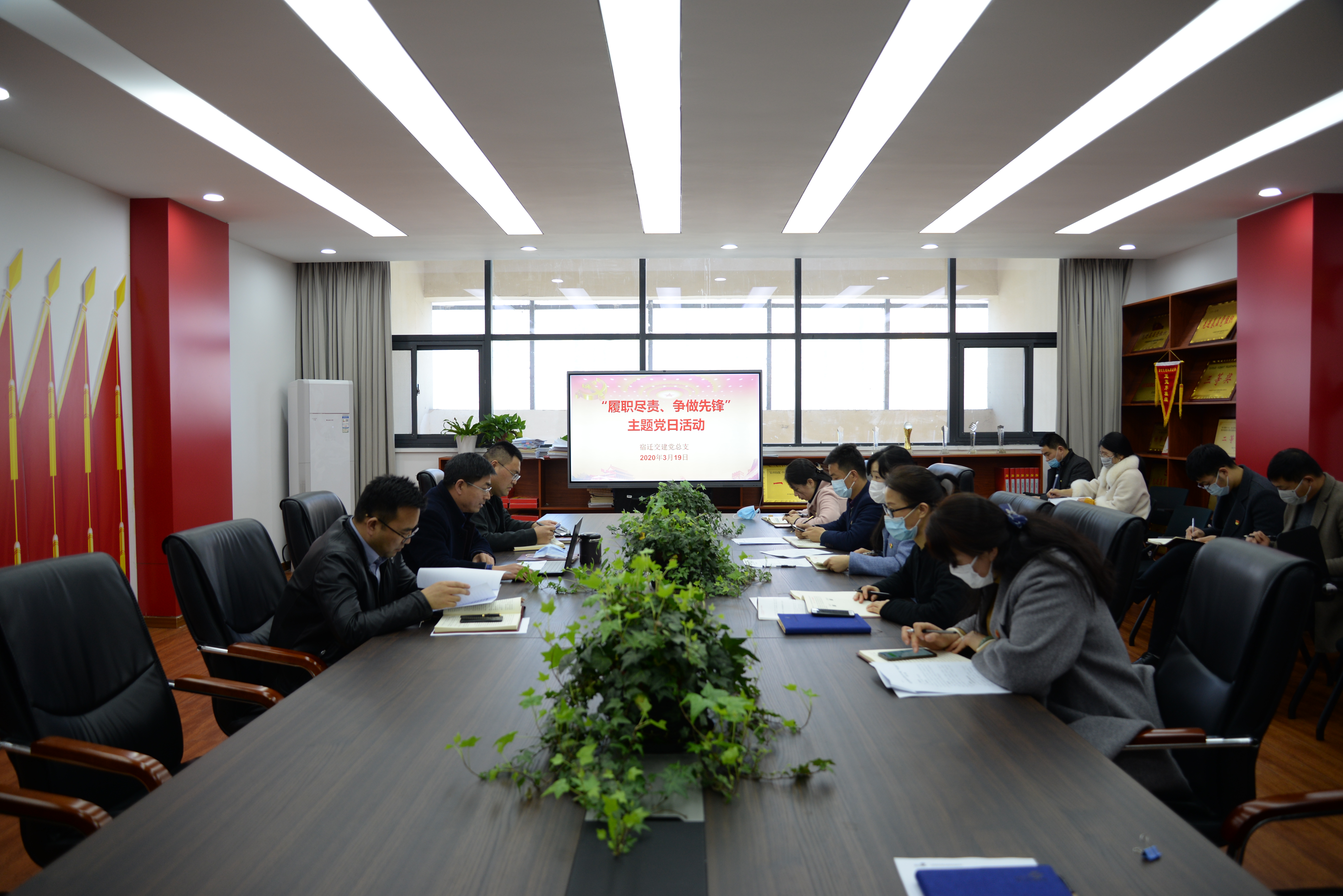 在疫情防控期间,为充分发挥广大党员同志的先锋模范作用,3月19日下午,宿迁交建党总支开展“履职尽责、争做先锋”主题党日活动。此次活动通过“学习强国”视频会议采取“线上+线下”的形式,设置一个主会场和两个分会场,公司全体党员、入党积极分子参加会议,总支副书记周俊主持会议。
