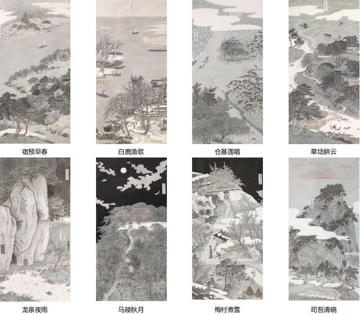 玖酒飘香浮雕的东西两侧,分别设计了长29米、高3.9米的文化长廊,其上各镶嵌了四幅宿迁历史人文美景雕板,由国家一级美术师、宿迁市政协副主席、民盟市委主委丁立江先生牵头,会同江苏省作家协会理事、宿迁市作家协会主席韩玉喜,中国书法家协会会员、江苏省书法家协会理事、宿迁市书法家协会主席张守跃,中国美术家协会会员郭鑫共同完成,每幅图样的创作都一一对应前人留下的诗句。相传“宿迁八景”出现于唐代,首载明万历《宿迁县志》,以后续修,皆有记载。“宿迁八景”即为:“宿预早春、白鹿渔歌、仓基莲唱、草埝耕云、龙泉夜雨、马陵秋月、梅村煮雪、司吾清晓”共八处风光。“八景”各具特色,景象殊奇,历代以来,项属之地文人雅士相聚于“八景”之地,曲水流觞,迎风弄月,留下了众多文化典故。