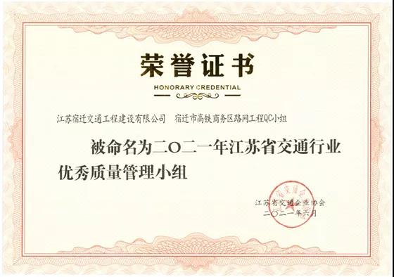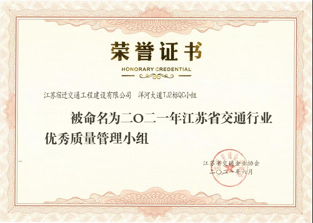 近日,宿迁交建268省道宿迁段工程项目QC小组、洋河大道TJ2标QC小组、宿迁市高铁商务区路网工程QC小组被江苏省交通企业协会授予“2021年度江苏省交通行业优秀质量管理小组”称号。