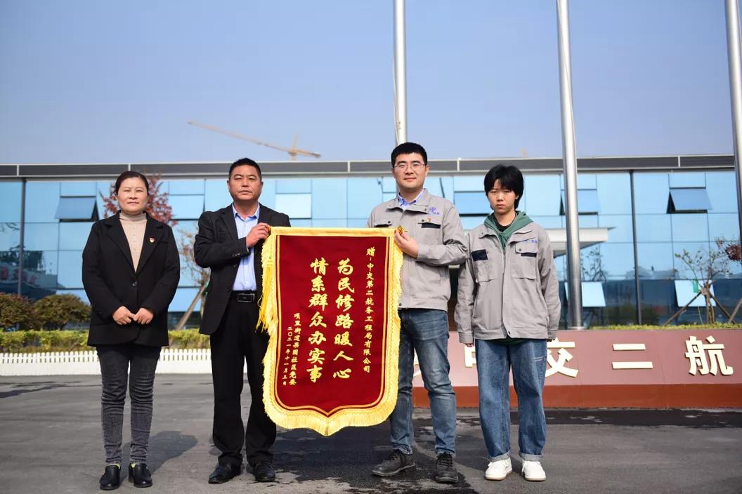 没过几天,宿城区项里街道果园社区工作人员将一面锦旗送到北京路快速化改造工程中交二航局项目部,感谢该项目部帮助解决群众出行难题。