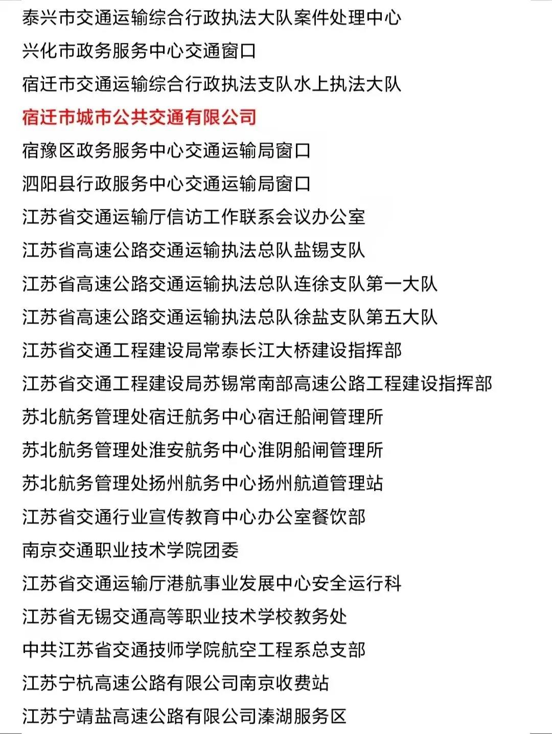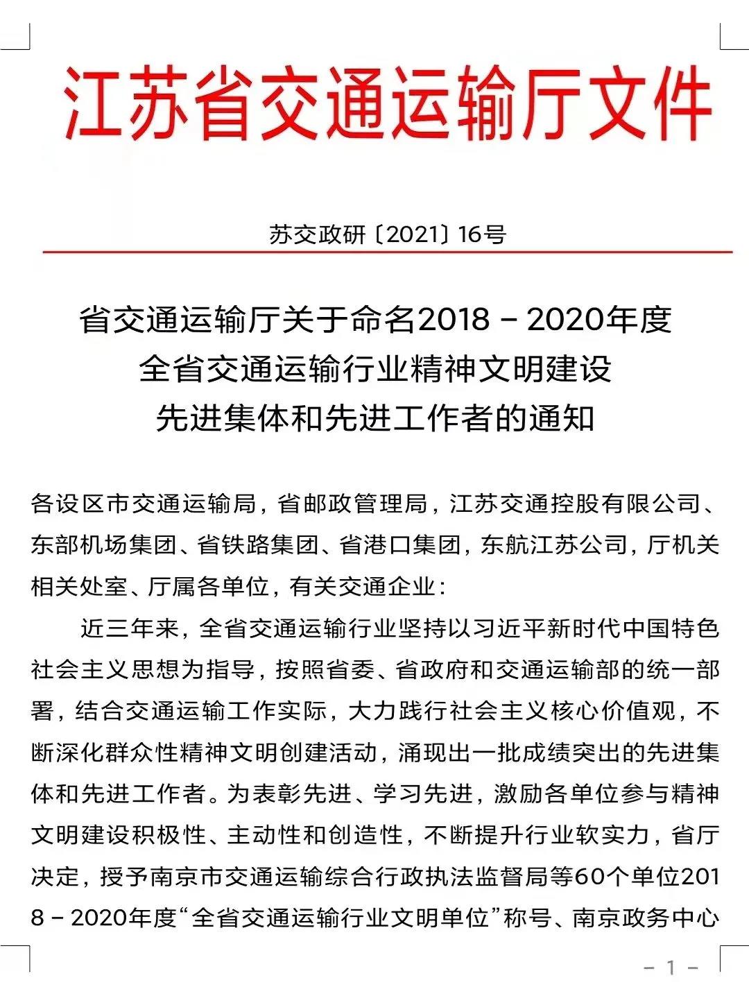 近日,江苏省交通运输厅印发《2018-2020年度全省交通运输行业精神文明建设先进集体和先进工作者的通知》,授予公交公司“2018-2020年度全省交通运输行业精神文明建设先进集体”称号。