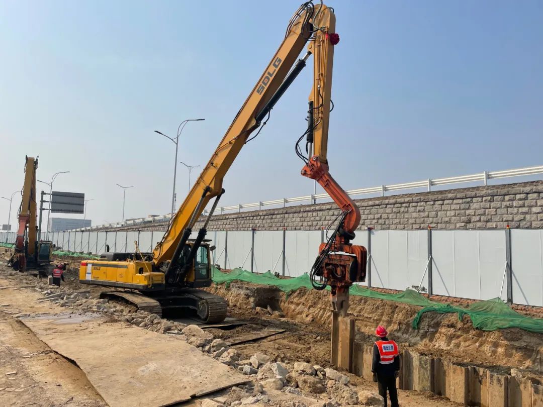 现场正在进行钢板桩施工作业,打桩机将钢板桩一根根地打入土中,声音铿锵有力。为高质量完成项目前期工作,项目部全体人员春节假期坚守岗位,三场建设、道路铣刨、道路导改等工作同步进行。截至目前,该标段三场灰土大棚建设完成,水稳拌合站组建工作完成70%,沥青面层和水稳碎石铣刨完成1.5立方千米。