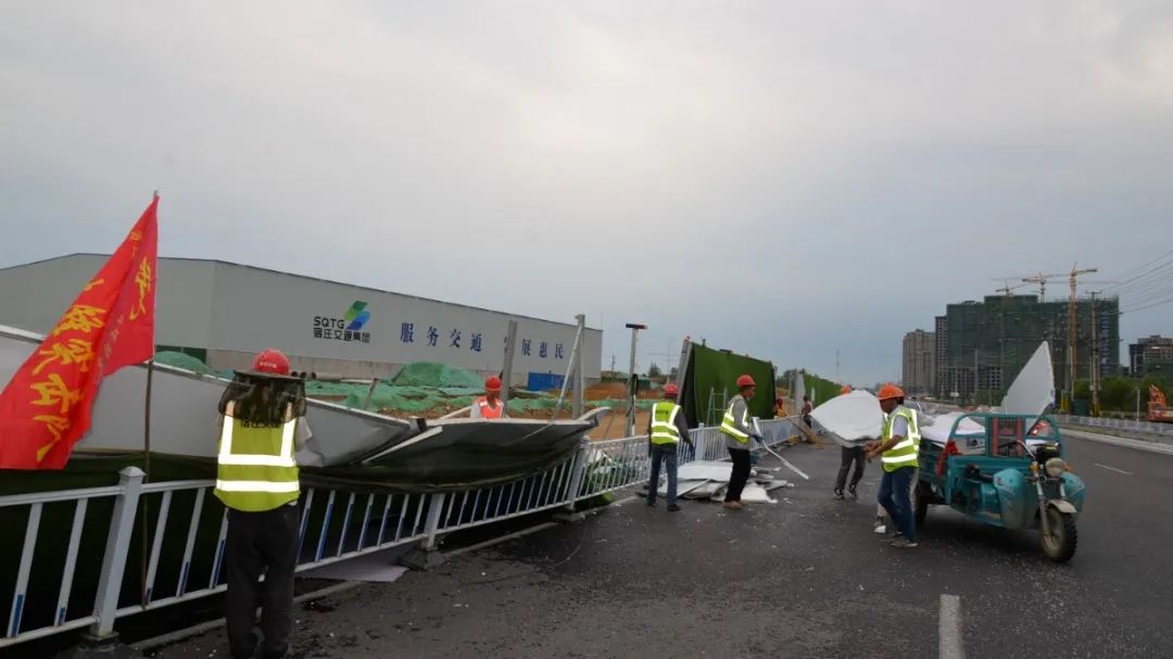 在狂风和暴雨的双重袭击下,现场的围挡出现了部分倒伏损毁的情况,面对现场的情况,宿迁交建工程项目党支部迅速组织“红箭突击队”第一时间赶往现场,全体党员顾不上围挡上锋利的边角和突出的螺钉,抓紧时间对损坏处进行清理和维护,及时消除道路安全隐患,确保现场道路交通通畅。