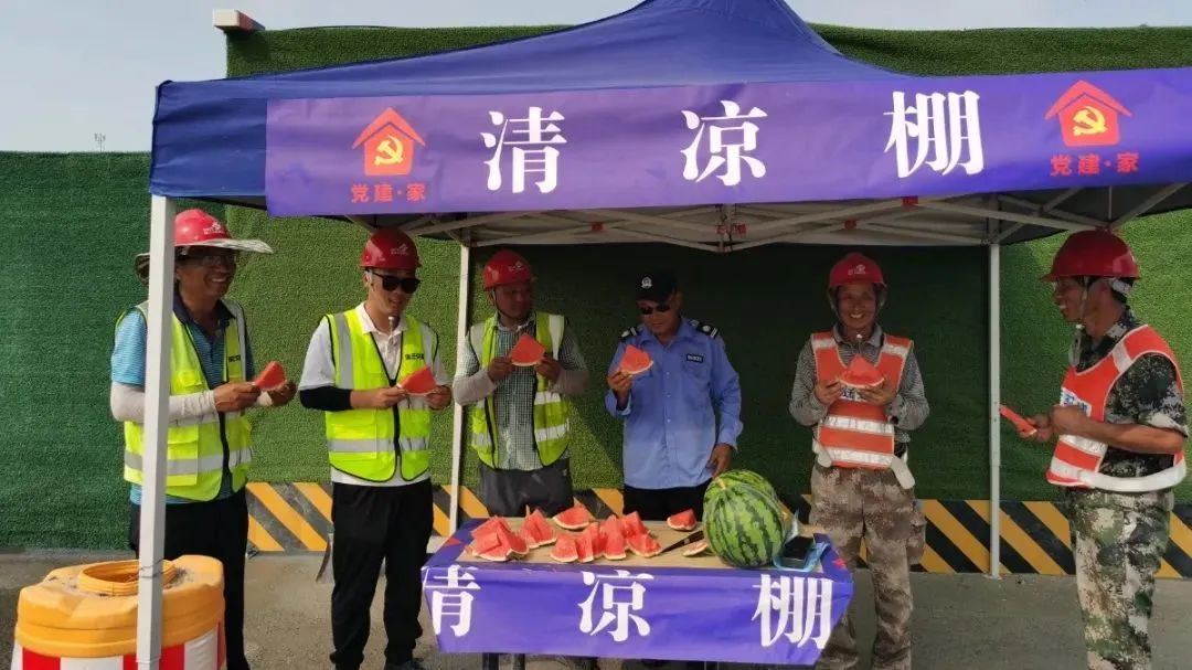 在公司迎宾大道二期快速化改造工程施工现场,“党建·家”清凉棚出现在工地的多个角落,棚内常备西瓜、矿泉水、藿香正气液等防暑降温物品,来往的施工人员热了渴了,来到棚内喝上几口茶,吃上几口瓜,消了暑继续为项目建设贡献自己的力量。