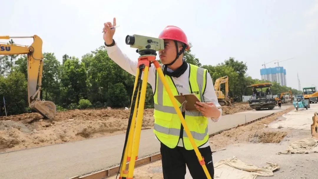 在迎宾大道二期快速化改造工程施工现场,机械轰鸣,施工人员在高温下挥洒汗水,紧锣密鼓地进行水稳摊铺。施工场地没有一丝阴凉,豆大的汗珠顺着晒红的脸颊淌了下来,但技术人员依然岿然不动,他深知测量工作差之毫厘,谬以千里。