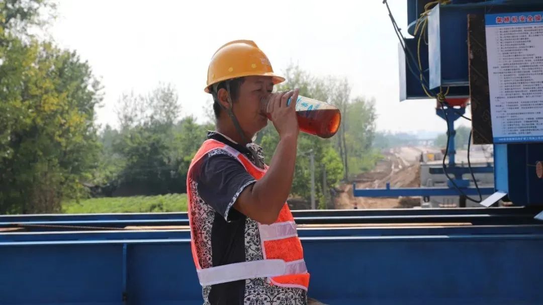 在268省道宿迁段工程(洋河新区段)和346省道宿豫段改扩建工程施工现场,建设者们热情高涨地进行桥梁架设,一名工人休息时刻喝着公司准备给他们的绿豆茶。