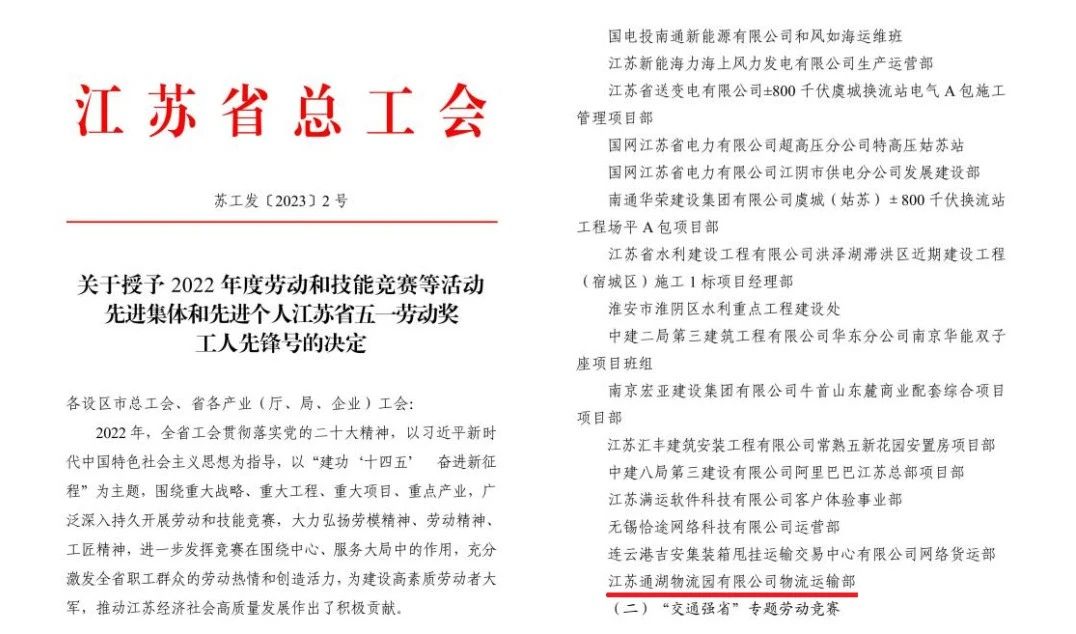 近日,江苏省总工会公布了2022年省五一劳动奖、工人先锋号名单,通湖物流园物流运输部获评“江苏省工人先锋号”。