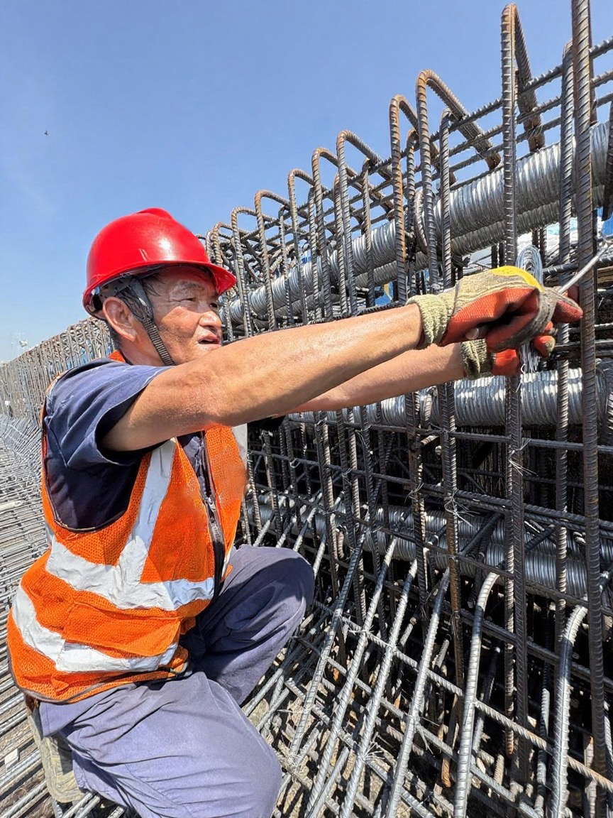 在钢筋绑扎施工作业中,工人们正顶着烈日进行钢筋的绑扎。为了防止钢筋被暴晒后温度过高影响施工安全,项目部特意准备了隔热手套,并要求施工人员每工作40分钟就到休息点降温。“虽然热,但看着新修道路一点点向前延伸,心里是比较骄傲的。”有着15年筑路经验的老工人李师傅说,这条高速建成后扩至双向十车道,车辆再多也不会堵车了,一想到这里,再热也有干劲了。